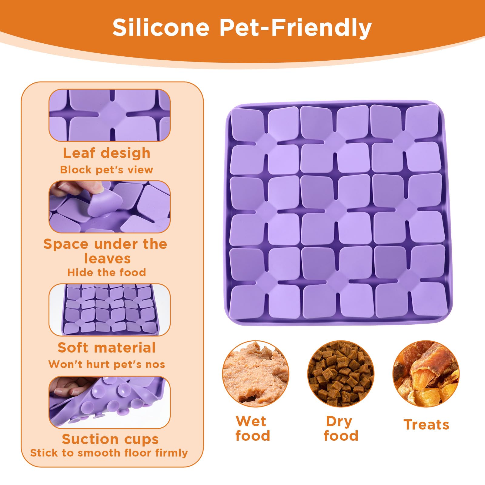 Silicone Safety Mat: Crafted from silicone, this Snuffle Mat and Lick Mat is inherently safety and odorless. Its material stability allows safe use directly from the freezer (-20°C) for soothing cool treats or straight from the dishwasher after cleaning, ensuring hygiene for every use with both dry kibble and wet food without risk of leaching harmful substances