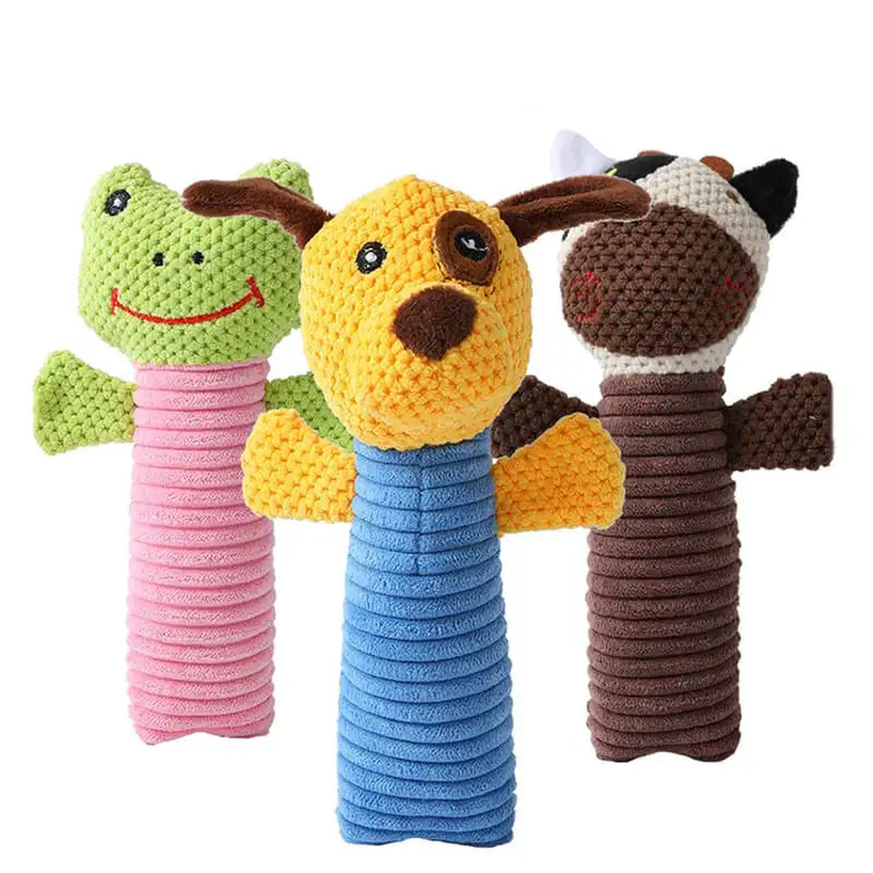- ✅ Dog Toys Set — Includes a cow, frog, dog, each measuring 8"L × 2.5"W (20.3 × 5.08 cm). Handmade with soft yarn and durable plush for a tactile experience. Dog plush toys are soft and cuddly, comforting, are designed for puppies of all breeds.