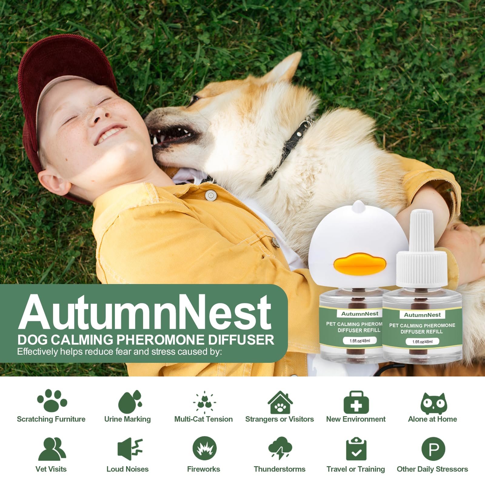 【Helps Calm Within 14 Days – Natural, Gentle Formula】 Using safe synthetic pheromones inspired by mother-dog signals, AutumnNest helps soothe your dog within 1–2 weeks. Perfect for separation anxiety, fireworks, thunderstorms, travel, or visits to the vet, this diffuser offers gentle and consistent comfort.