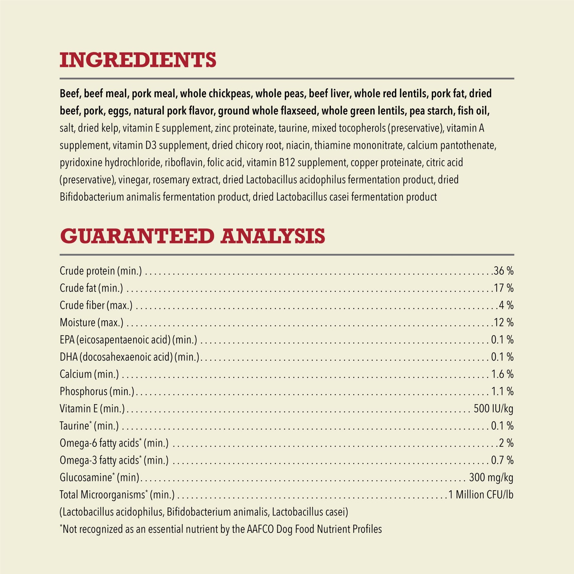- High-protein dog food recipe features fresh farm-raised beef, beef liver and Yorkshire pork and is balanced to include 70 percent* animal ingredients and 30 percent** plant ingredients and nutrients