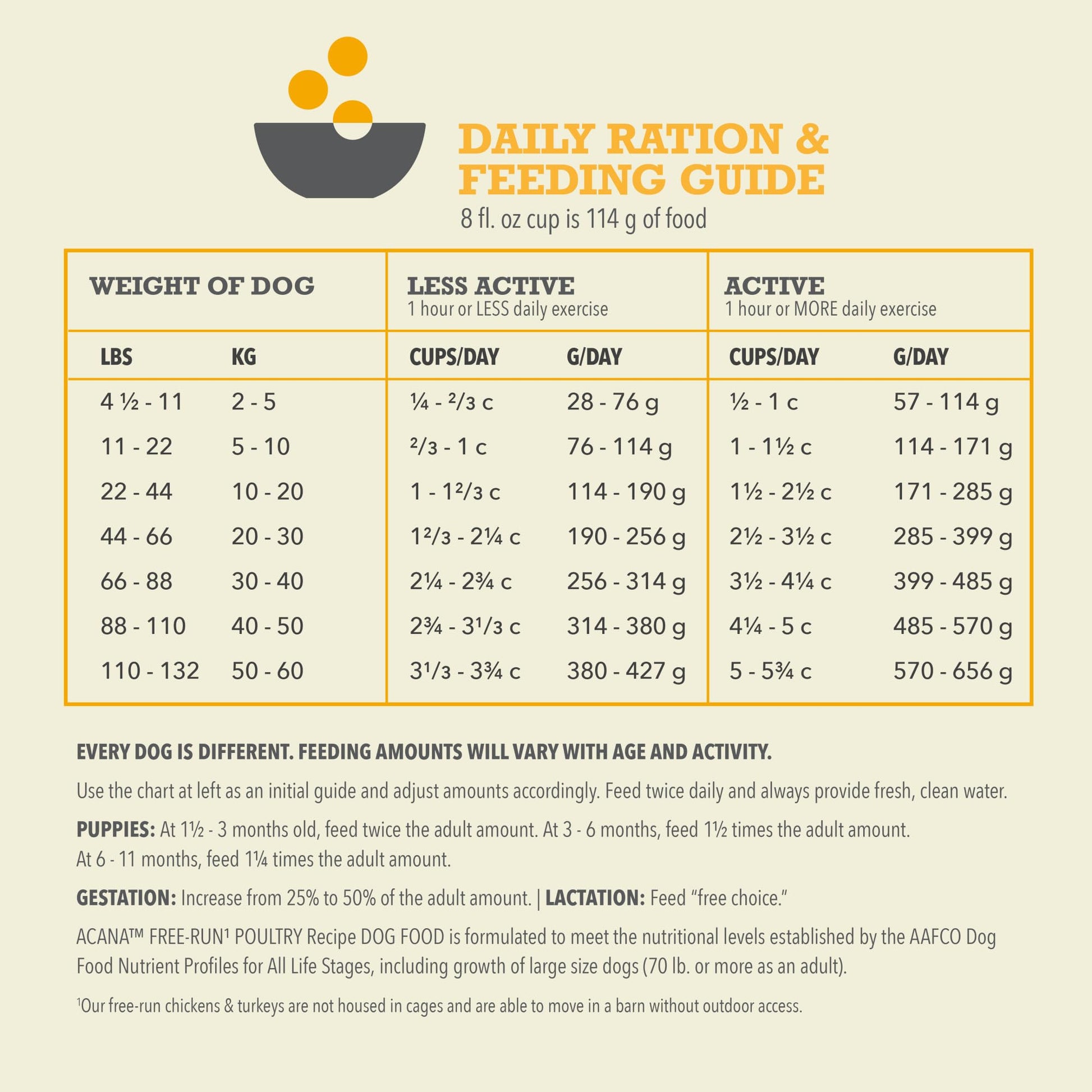 Help your dog thrive with the protein-rich, nutritious and delicious ingredients in ACANA Free-Run Poultry**** Grain Free* Dry Dog Food. This ACANA dog food contains no grain ingredients and includes added pre- and probiotics to help support your dog's digestive health. Free-run**** chicken, turkey and cage-free eggs are balanced with vegetables and fruits. This dog food kibble provides the biologically appropriate nutrition your dog needs to maintain a healthy weight with 60 percent** premium animal ingredients and 40 percent*** vegetables, fruits and nutrients. Choose ACANA dry dog food to give your companion the nutritional foundation they need to live a happy, healthy life. *Produced in a facility that also processes grains **Approximate and derived from the unprocessed state of the ingredients ***We also add vitamins, minerals, natural preservatives, flavors and probiotics ****Our free-run chickens and turkeys are not housed in cages and are able to move in a barn without outdoor access