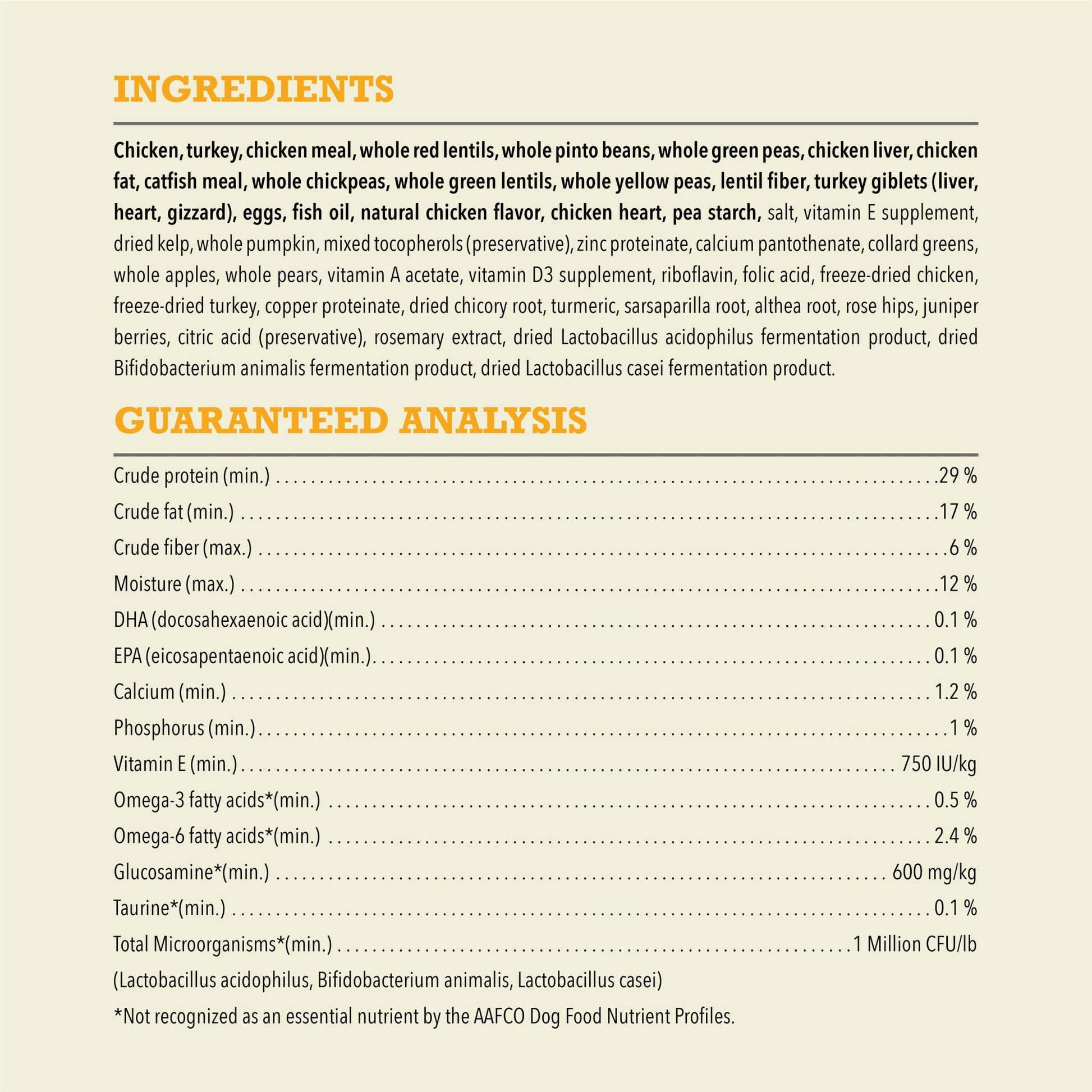 - Grain free* dry dog food recipe made with free-run chicken****, turkey**** and cage-free eggs, providing a balanced 60 percent** premium animal ingredients and 40 percent*** vegetables, fruits and nutrients to help your dog thrive