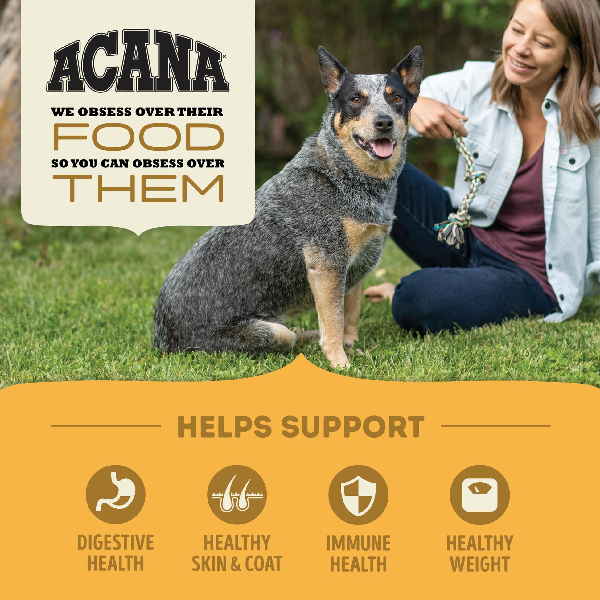 - ACANA dog food offers a balanced diet with high protein animal ingredients and fruits and vegetables plus a blend of prebiotics and probiotics to help dogs maintain a healthy weight