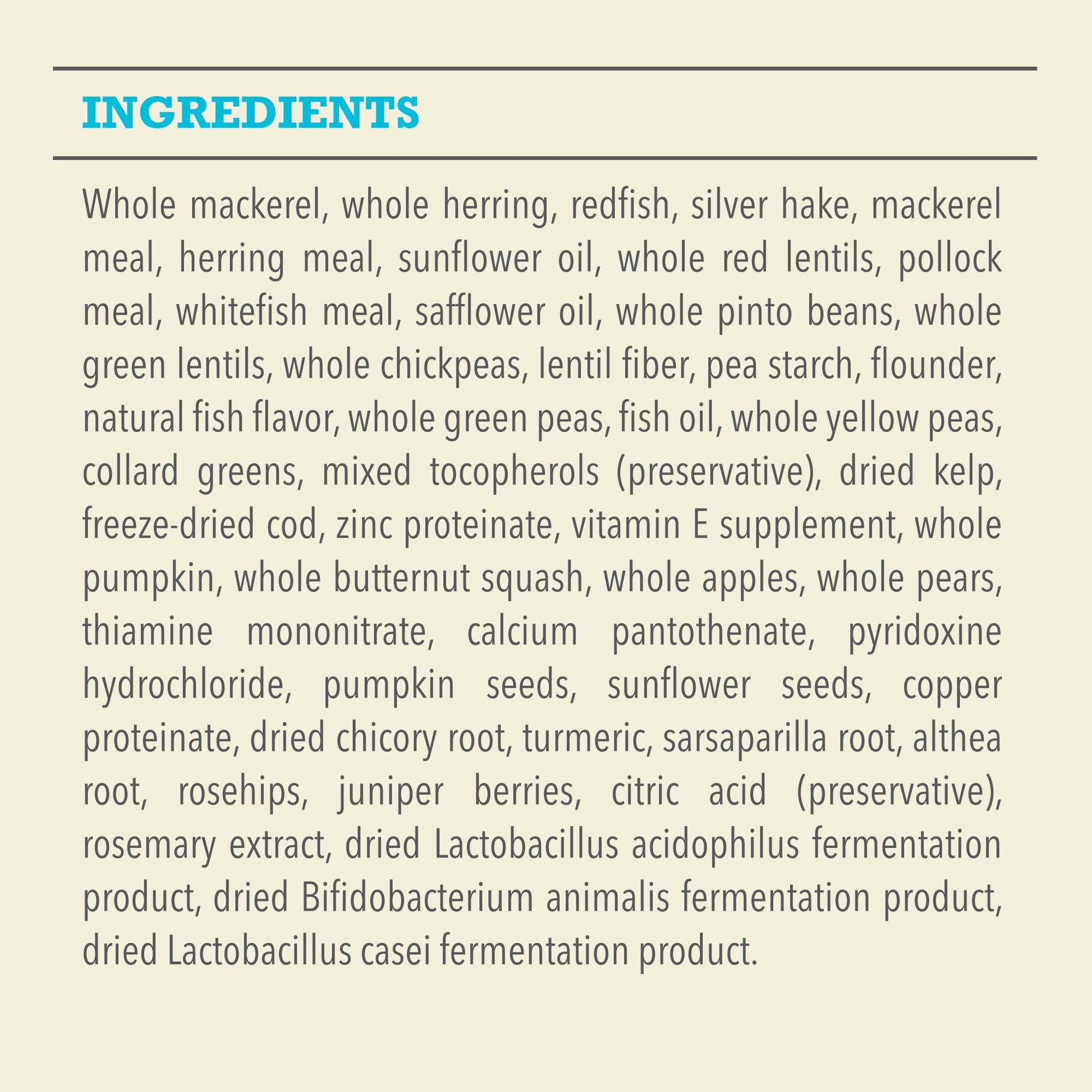 Details: Bring home the quality nutrition your dog needs to thrive with ACANA Grain Free* Wild Atlantic Recipe Dry Dog Food. With the highest protein offering in ACANA pet foods, this high protein dog food is for all life stages and includes prebiotics and fiber to support healthy digestion. Protein-rich mackerel, herring, redfish, silver hake and flounder are balanced with whole pumpkin, collard greens, butternut squash, apples and pears to offer a nutritious, high-fiber option for your dog. This ACANA dog food is 70 percent** quality animal ingredients and 30 percent*** fruits, vegetables. Even better, this grain free* dog food kibble has a freeze dried dog food coating made of cod liver for a delicious taste your dog will crave. Choose ACANA grain free* dry dog food to give your companion the nutritional foundation they need to live a happy, healthy life. *Produced in a facility that also processes grains**Approximate and derived from the unprocessed state of the ingredients ***We also add vitamins, minerals, natural preservatives, flavors and probiotics