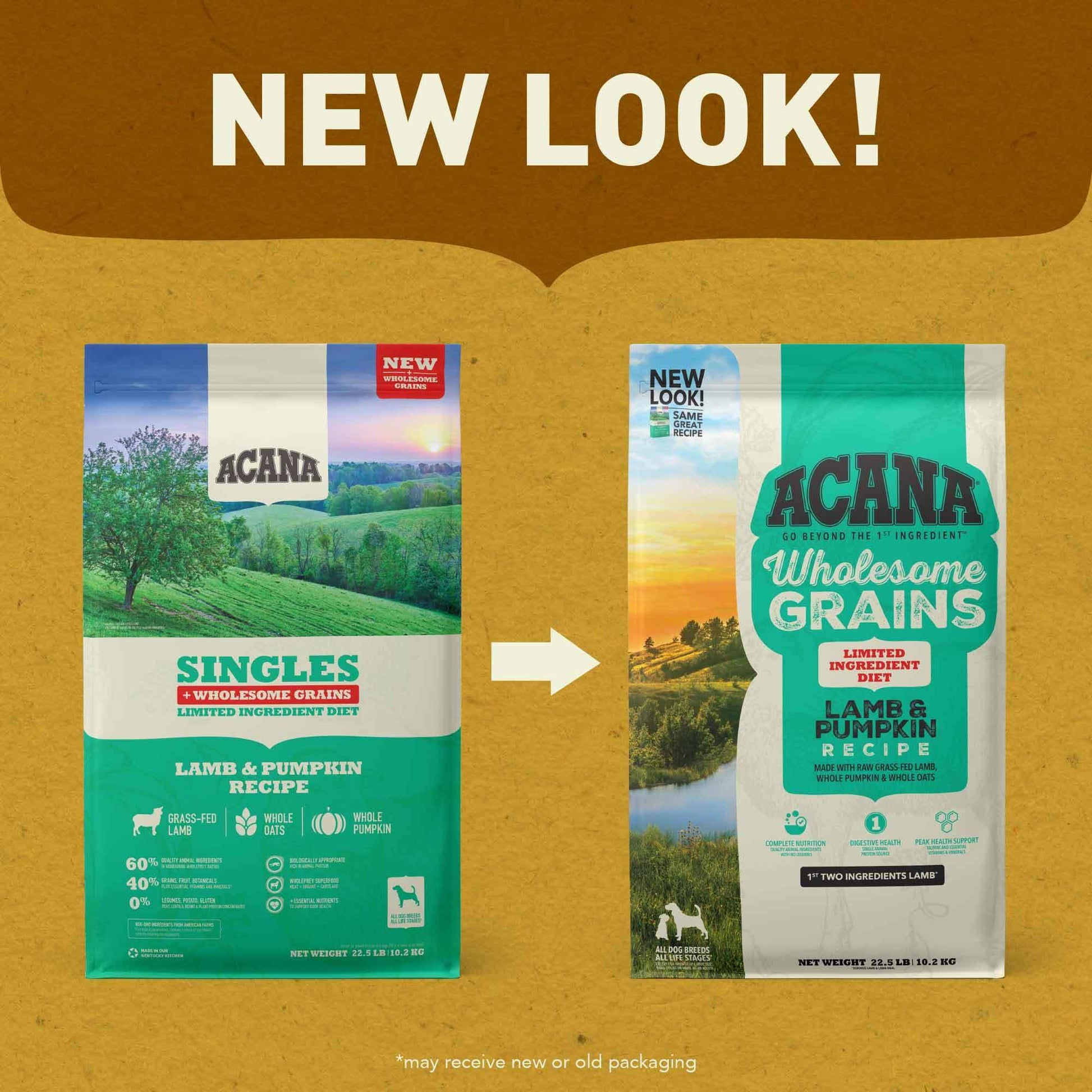 - One (1) 22.5 lb bag of ACANA Wholesome Grains Lamb & Pumpkin Recipe Dry Dog Food