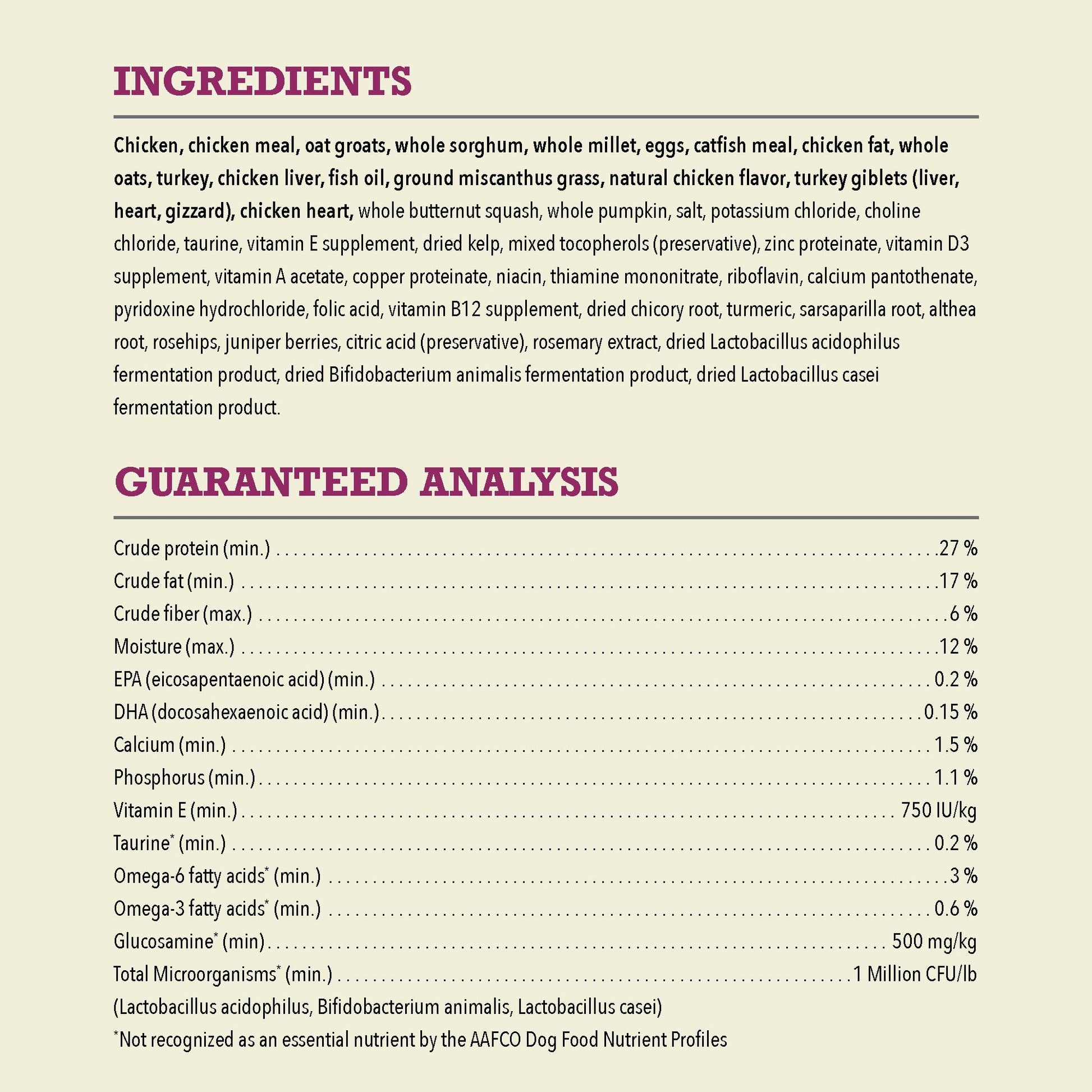 - A fiber-rich grain blend, featuring oats, sorghum and millet, plus a blend of pre- and probiotics for dogs, helps provide dog digestive support.