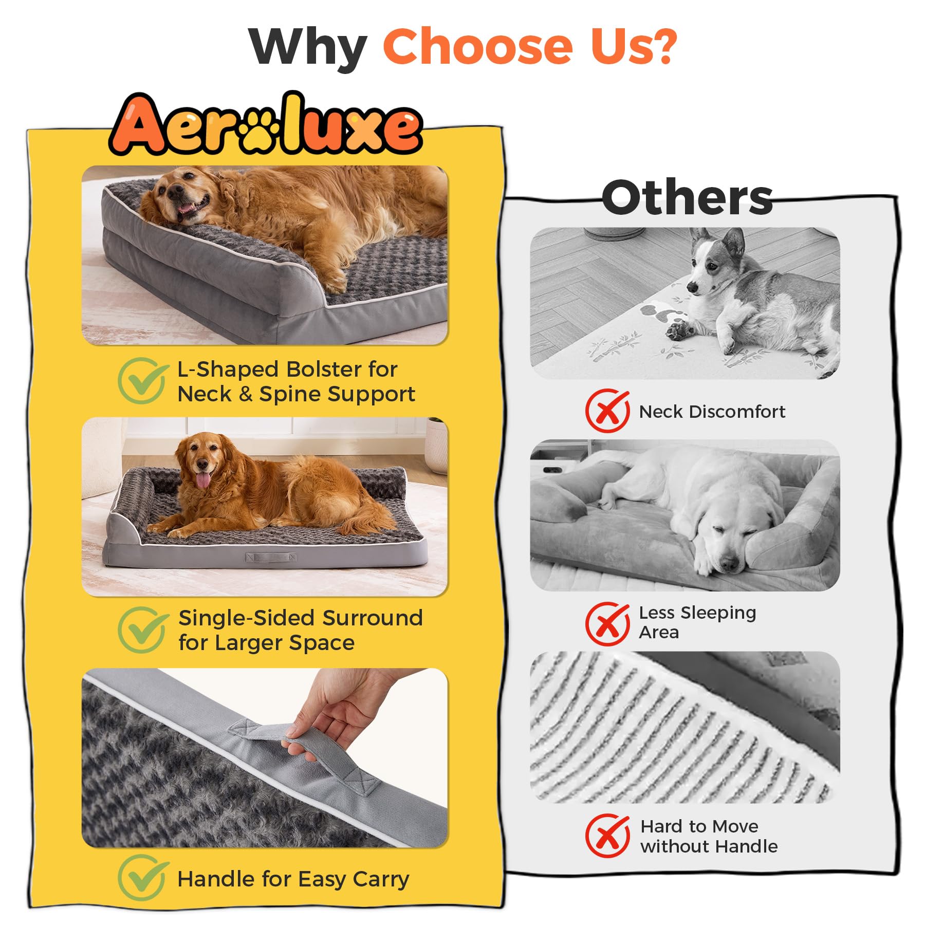 Aeroluxe Dog Bed Large Sized Dogs, XL Orthopedic Dog Bed for Large Dogs, Waterproof Pet Bed with Washable Removable Cover, L-Shaped Pet Couch with Portable Handle 42"x30"x7.5", Grey