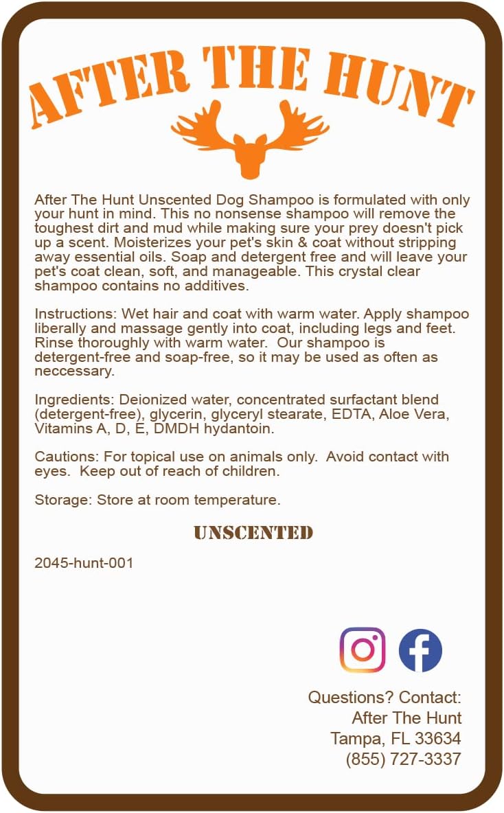After The Hunt Unscented Dog Shampoo 8 oz - Will clean your dog and make sure your prey doesn't pick up a scent. Moisturizes your pet's skin without stripping away essential oils. Soap and detergent free formula will leave your dog's coat clean, soft, and manageable.