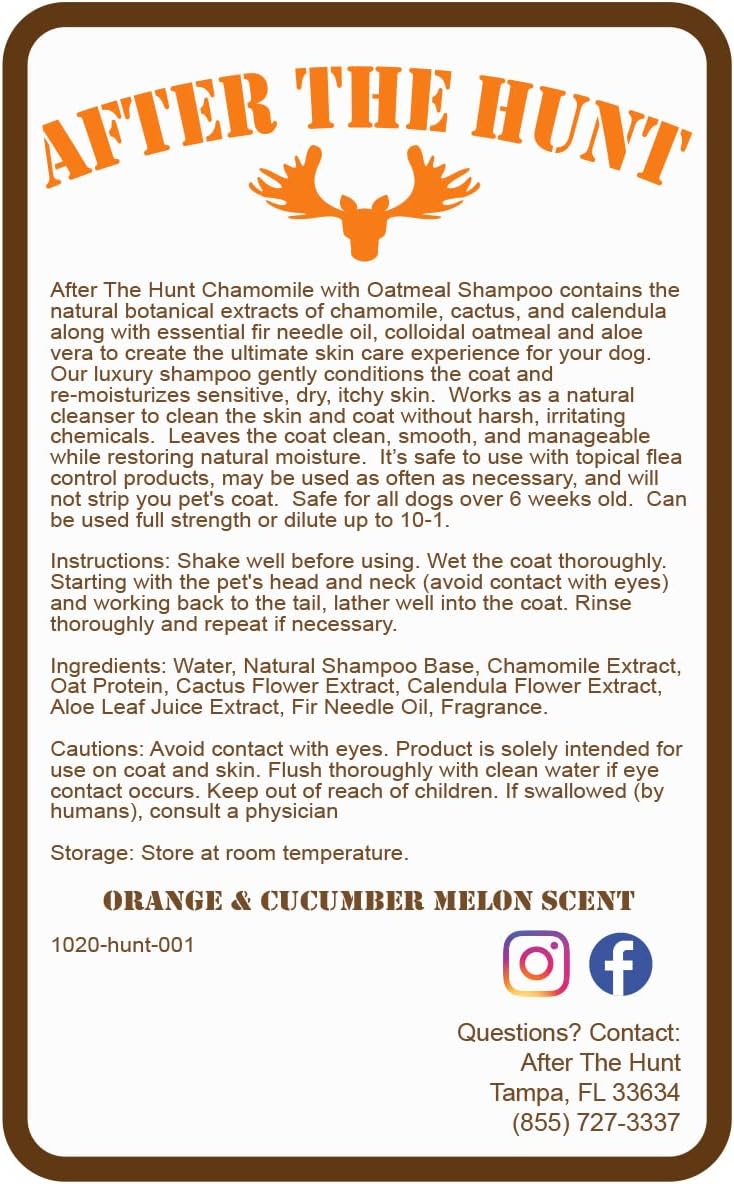 After The Hunt Chamomile with Oatmeal Shampoo 8 oz - Contains the natural botanical extracts of chamomile, cactus, calendula, fir needle oil, colloidal oatmeal and aloe vera to create the ultimate skin care experience for your dog. Gently conditions the coat while remoisturizing and nourishing the skin with naturally produced oils.