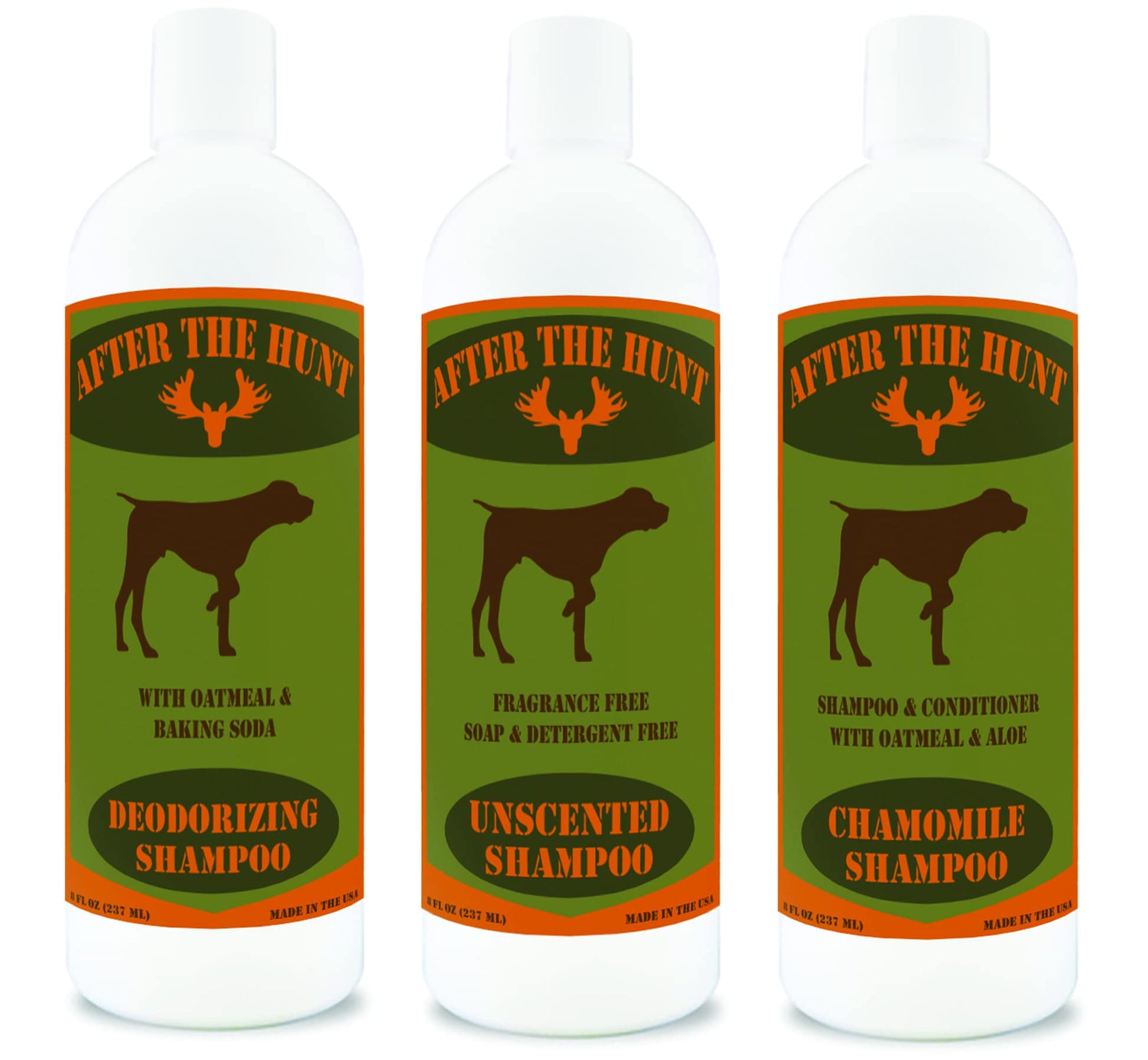 Details: After The Hunt Complete Hunting Dog Shampoo System has been specifically designed for a hunting dog's regiment. Use the unscented shampoo prior to the hunt to make sure your dog doesn't give away your position. After the Hunt, utilize the deodorizing shampoo to help remove any odors and dirt. For everyday in between, use the Chamomile & Oatmeal Shampoo to ensure a healthy coat and restore the shine. This 3 pack will save you money!