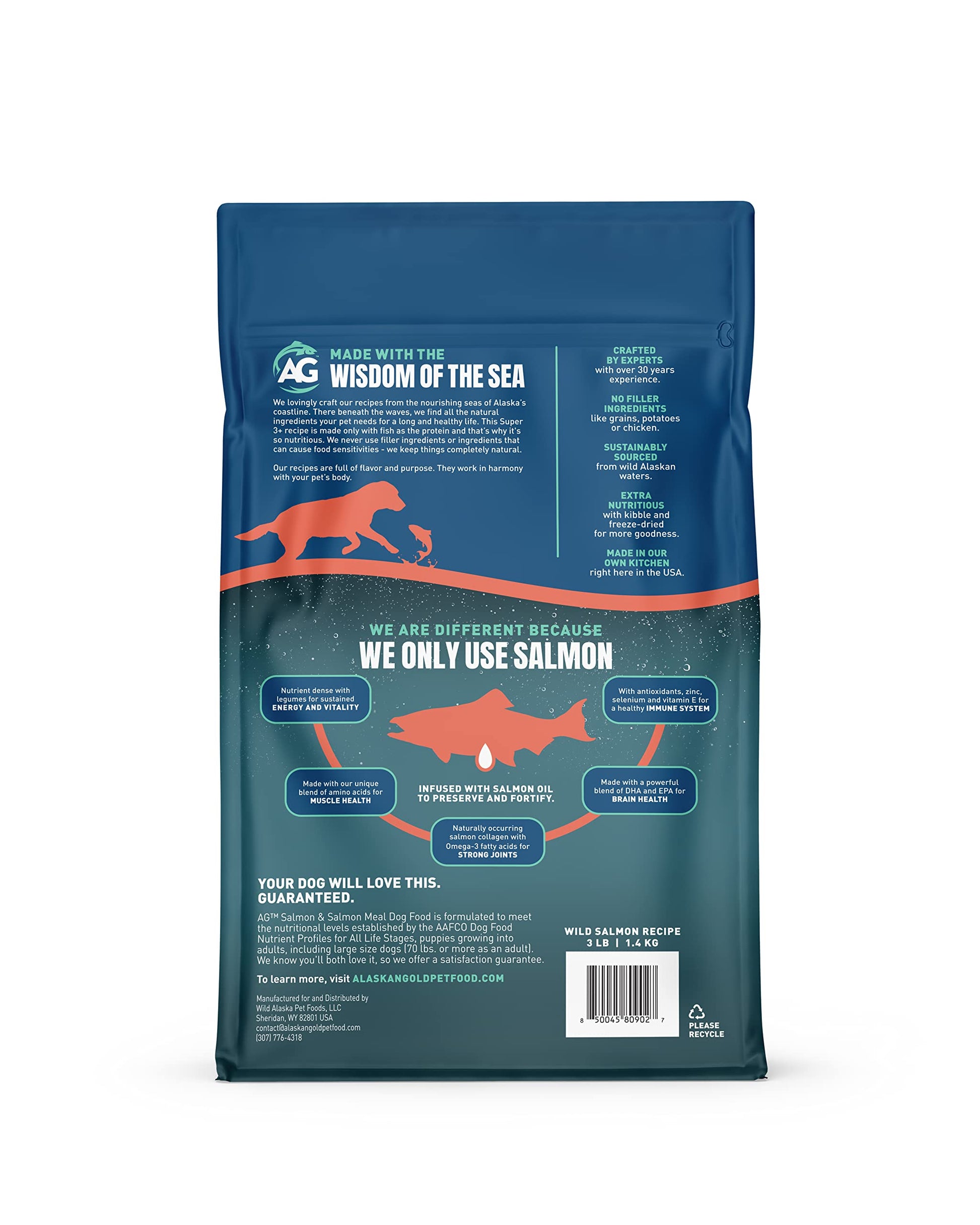 - ALASKAN GOLD WILD SALMON SUPER3+ is a blend of high-protein, grain-free salmon kibble, freeze-dried raw salmon, and salmon oil, enhanced with ocean supergreens for unbeatable nutrition. Wild-caught salmon is the #1, and ONLY animal ingredient in this unique recipe.