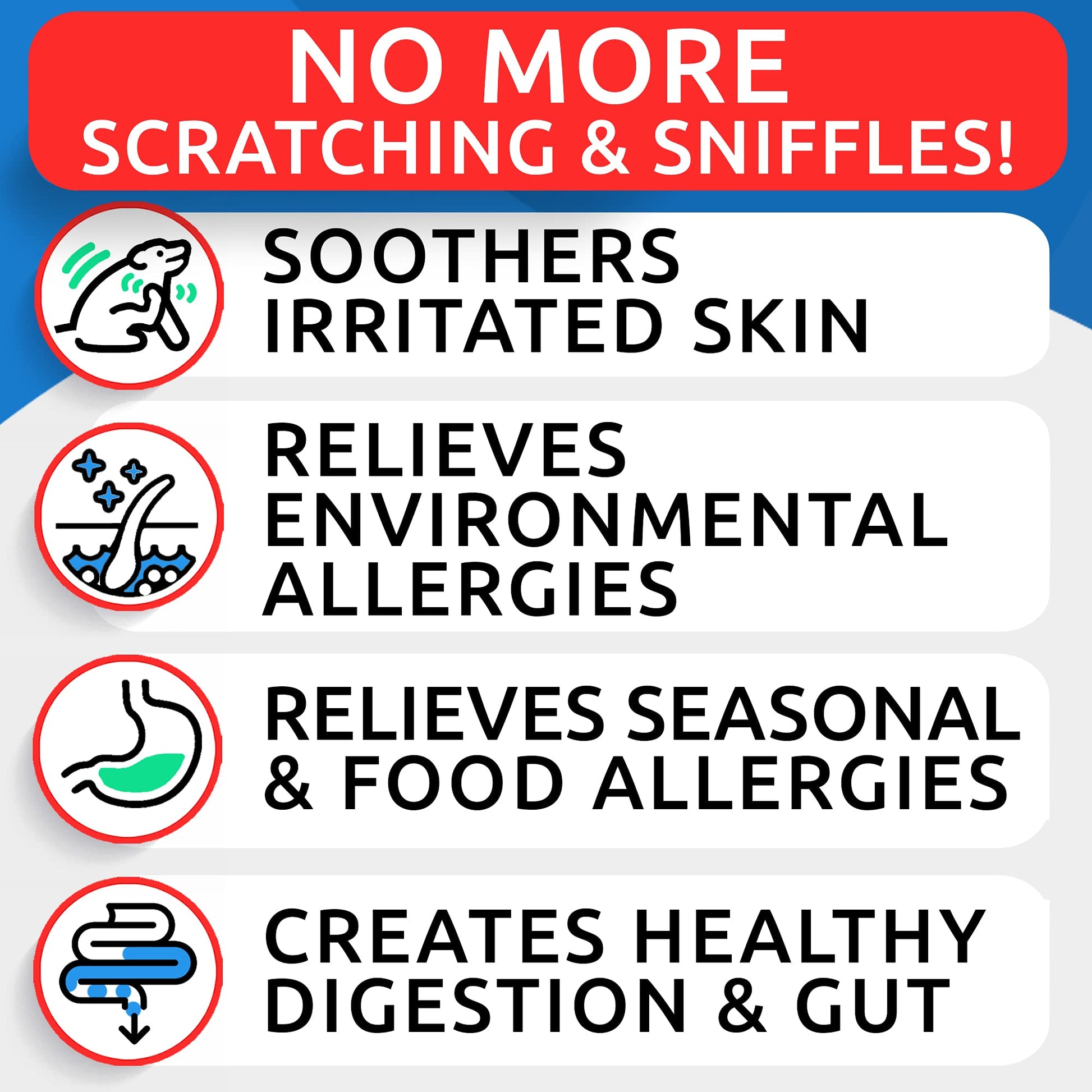 - One Stop Allergy Aid - prevent environmental pollutants, food and seasonal allergies, and ease symptoms like paw licking, itching, chewing & scratching, irritation, bald spots, rashes and hot spots.