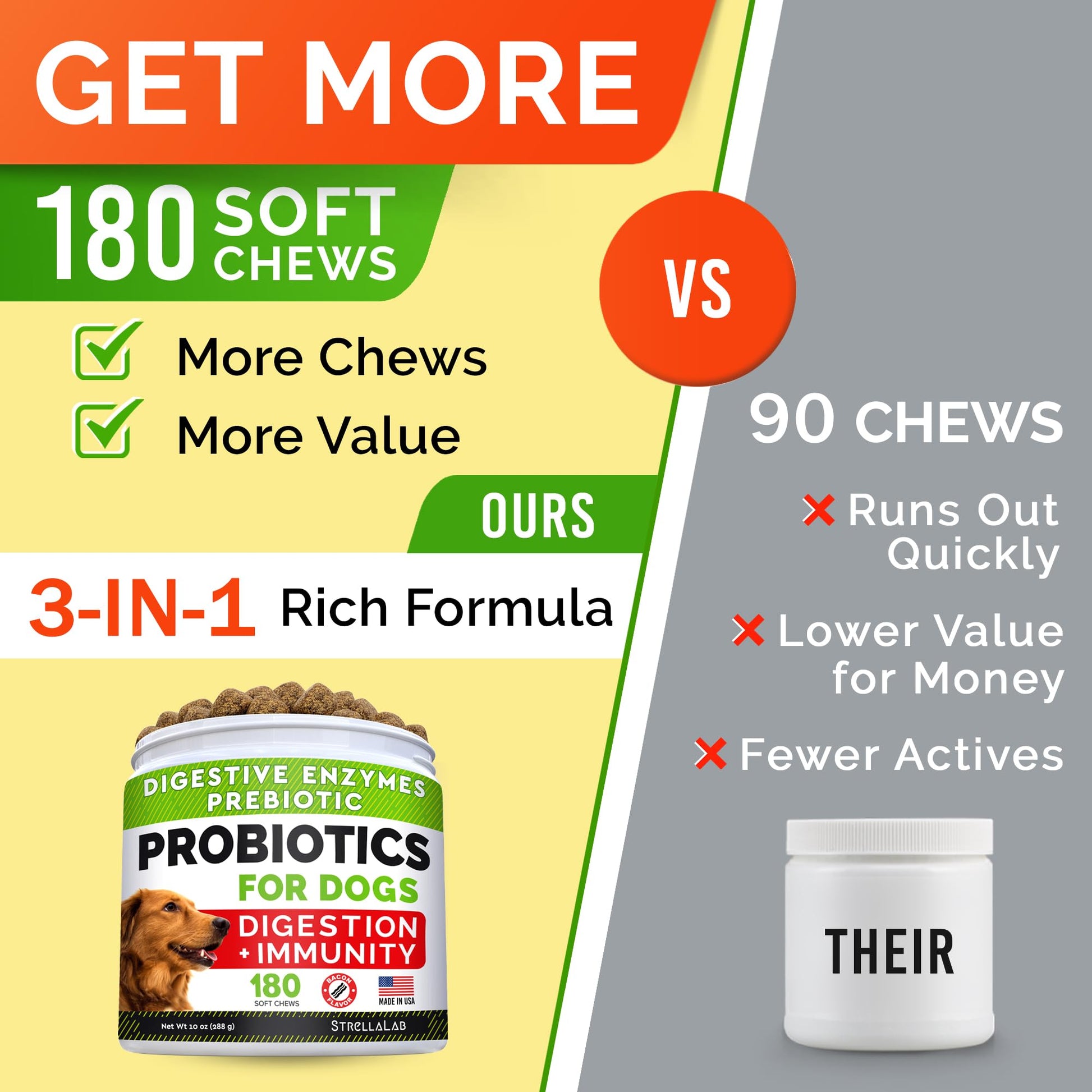 • ✅ Support Healthy Tummy - packed with all essential probiotic and prebiotic, fiber and enzymes, these probiotic chews for dogs will help easy varios stomach issues like gas, diareah, sensitive or upset stomach, constapation, gas, acid, loose stool, bad breath etc.