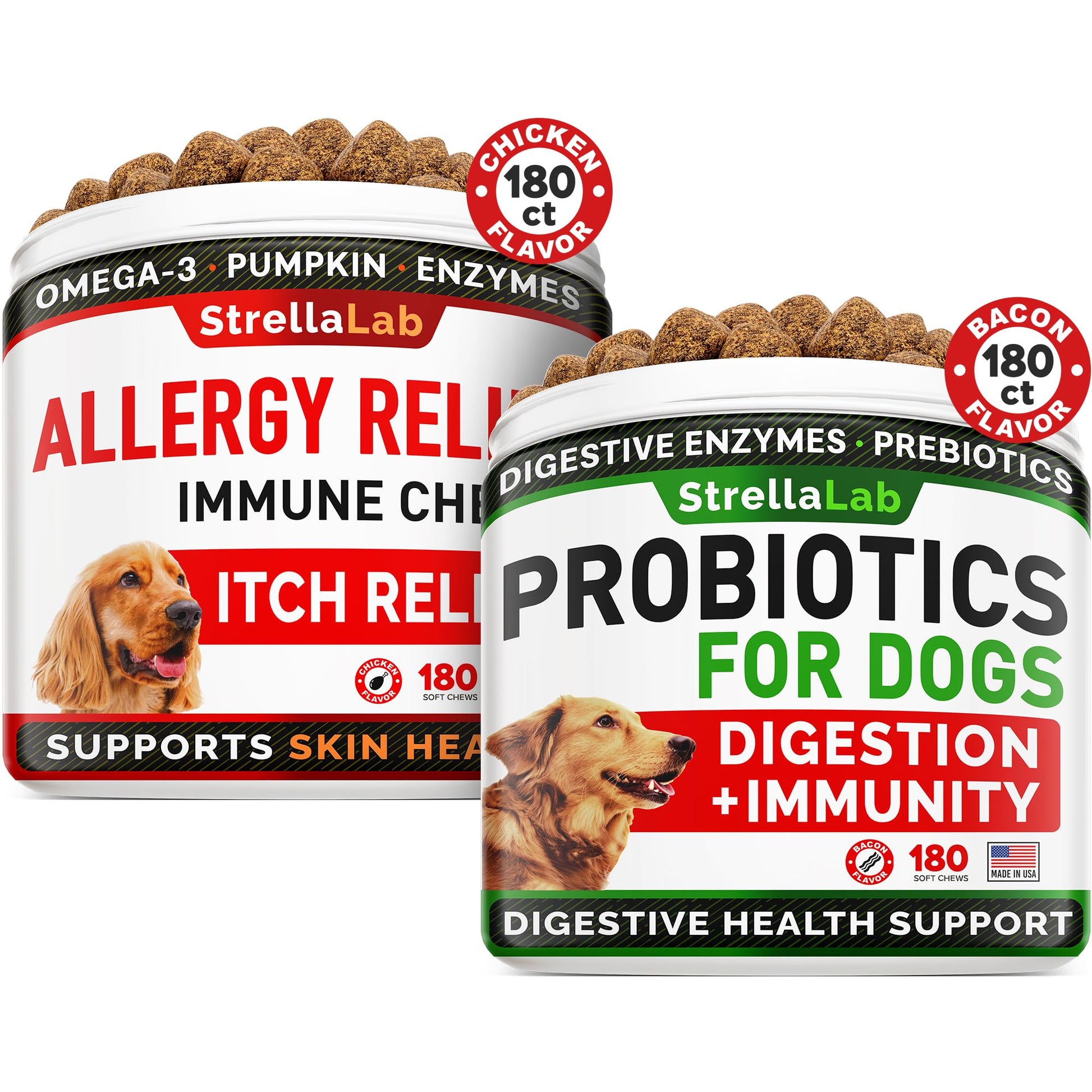 Allergy Relief + Probiotics Dogs Bundle - Itchy Skin Treatment + Digestive Enzymes - Omega 3 & Pumpkin + Prebiotics - Dogs Itching & Licking Treats + Improve Digestion - 360 Chews - Made in USA