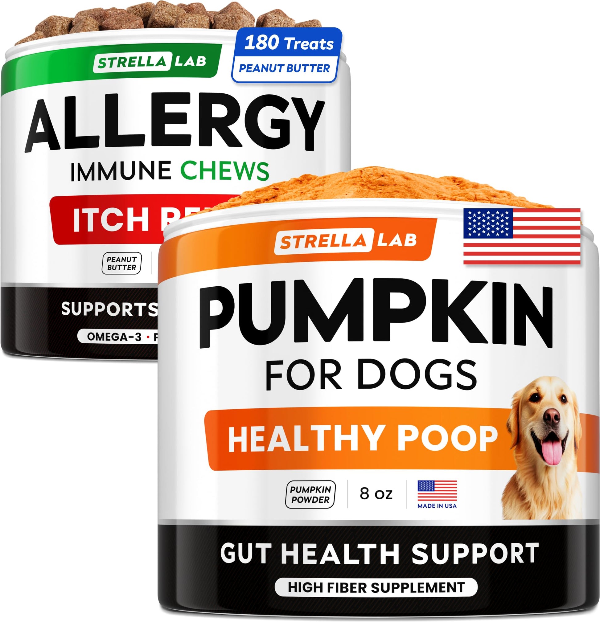 Allergy Relief + Pumpkin for Dogs Bundle - Itchy Skin Treatment + Stool Consistency and Softener - Omega 3 - Itchy Skin, Shedding + Diarrhea, Constipation, Upset Stomach - 180ct + 8.1oz - Made in USA