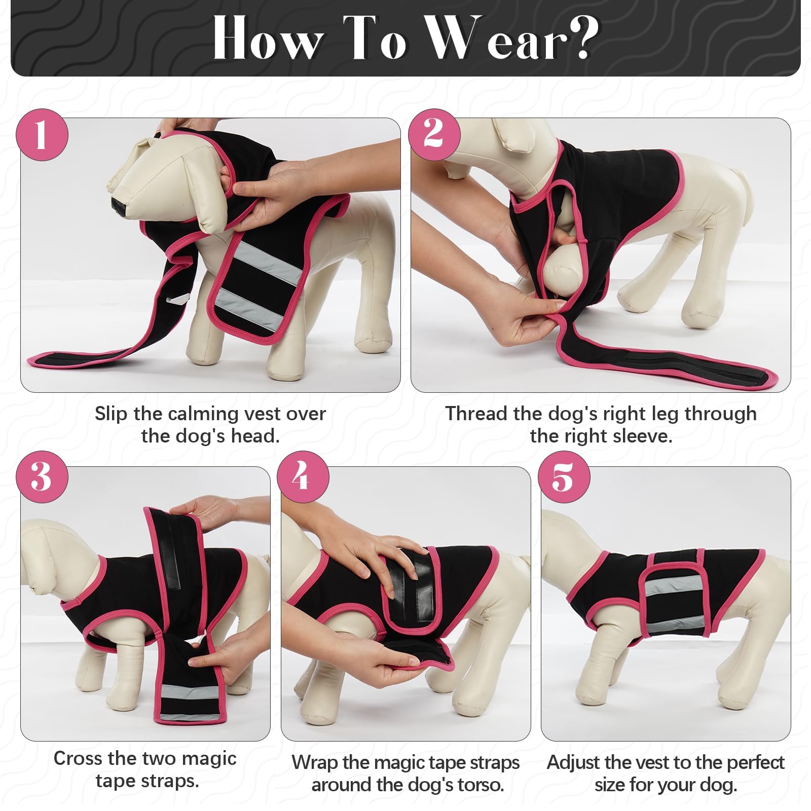 • Easy to Wear and Use: Our dog calming vest is effortlessly wearable and user-friendly. Simply slide the anti-anxiety shirt over your dog's head and secure it in place using the convenient magic tape closures. The lightweight and breathable fabric ensures your pup remains comfortable while wearing it.