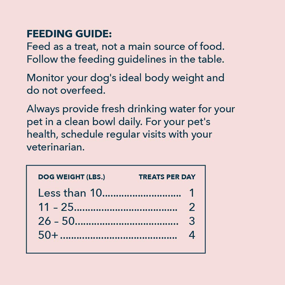- FEEDING GUIDE: You may break the jerky into smaller pieces for treating; if it’s your dog’s first time start with half of the suggested treating amount and gradually increase to the full amount