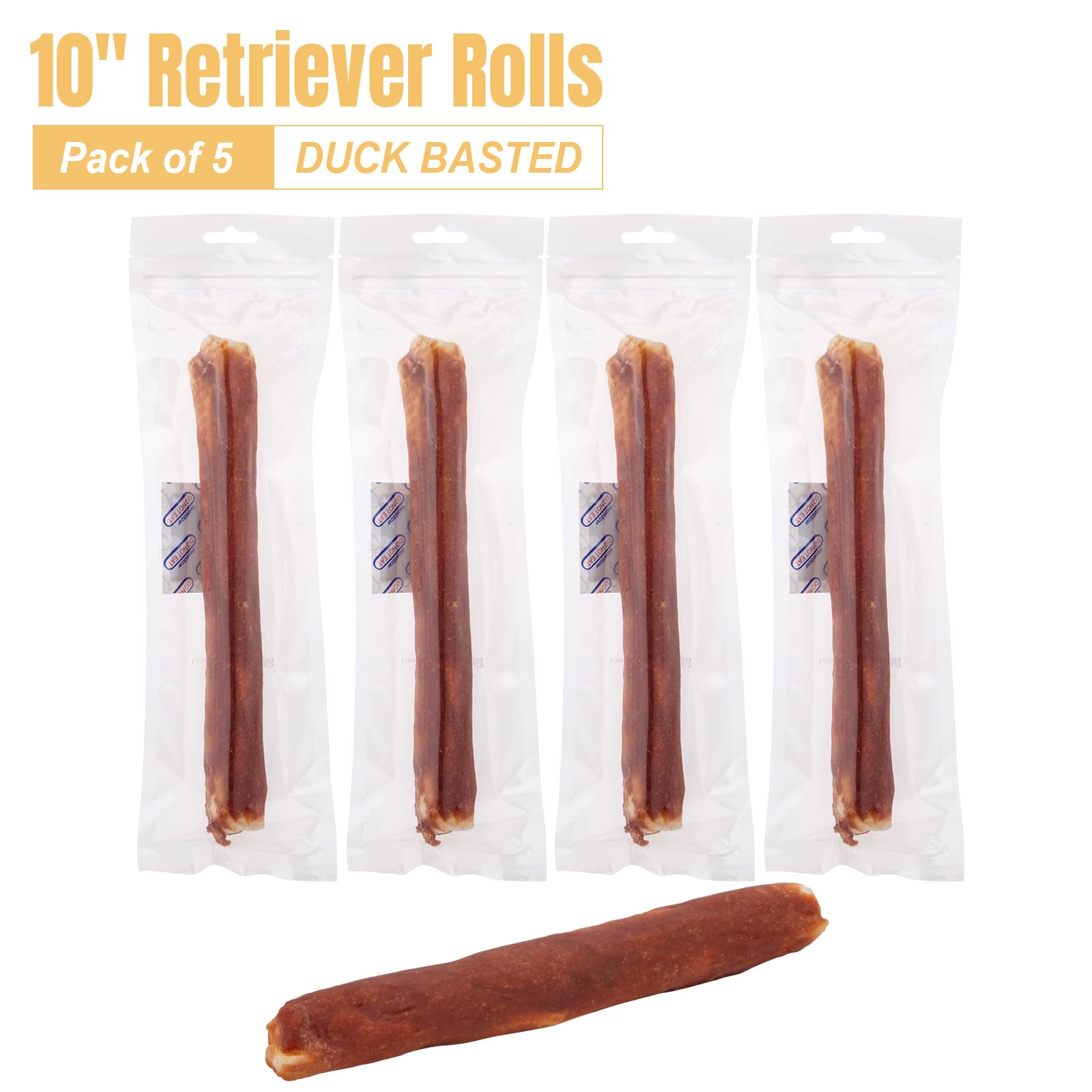 Amzey 10" Rawhide Retriever Rolls Dog Chews Treats, Duck Wrapped Rawhide Bones Long-Lasting for Large Dogs 50lbs Up, All Natural Duck Basted Dog Rawhide Chews, 5 Count