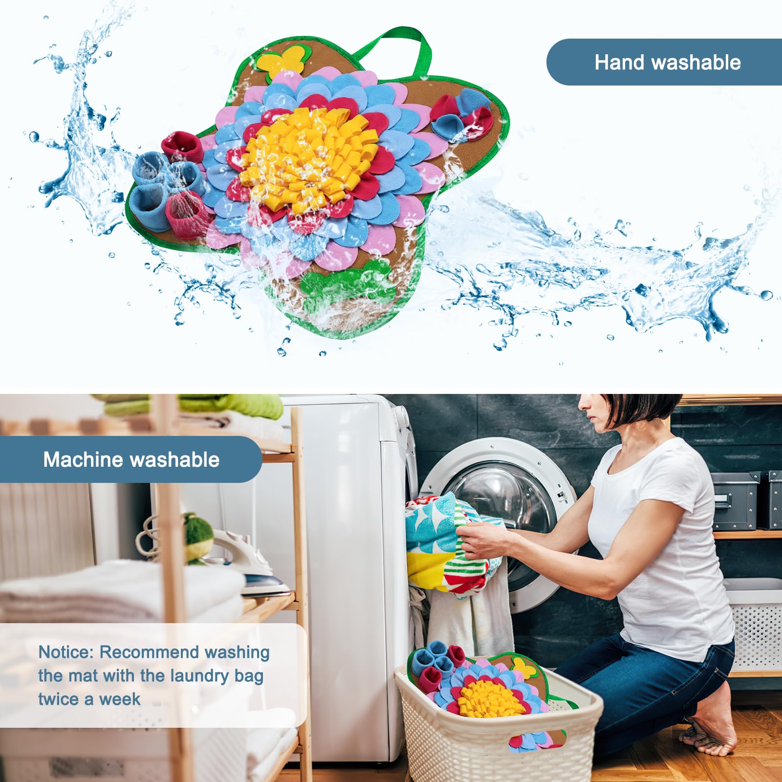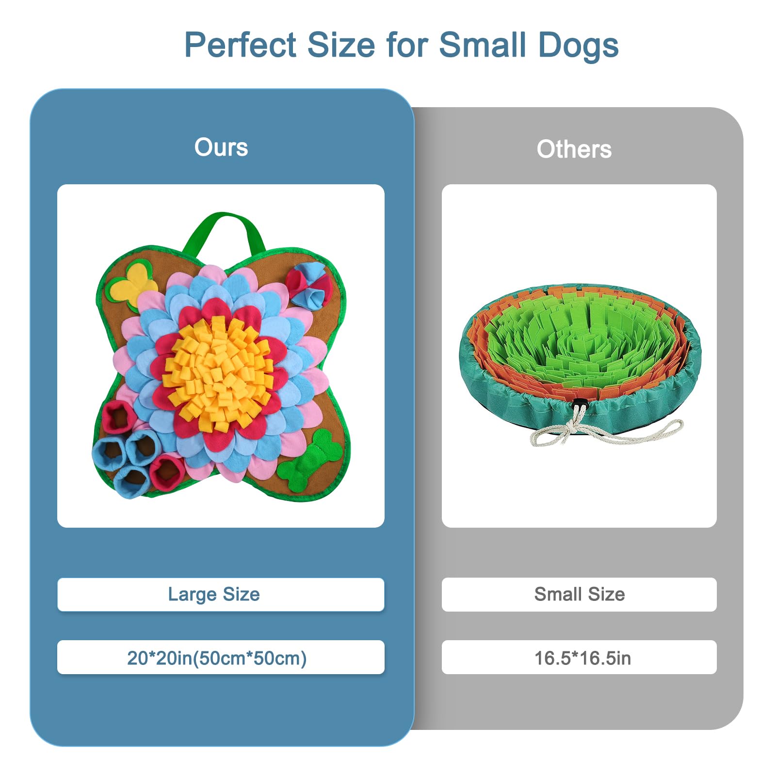 • Ample Snack-Hiding Space: With a generous size of 20’’ x 20’', this large sniffing mat offers ample room to hide snacks of various sizes, extending your puppy’s sniffing enjoyment. Suitable for dogs of all sizes, our flower-shaped mat in vibrant yellow and blue hues is visually stimulating for your pet.