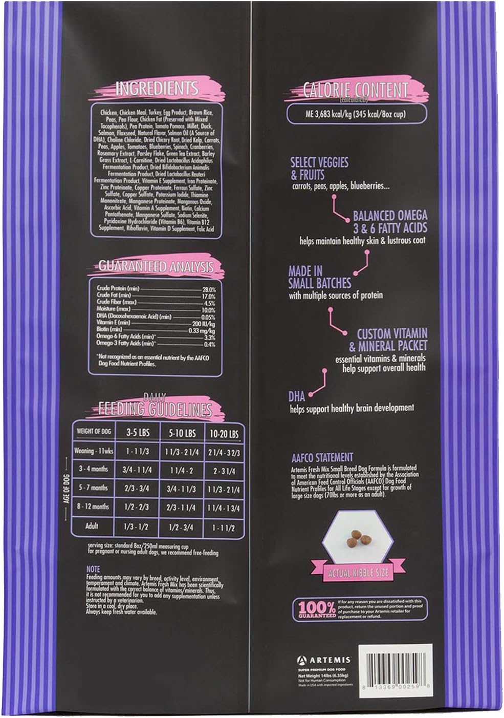 ARTEMIS Fresh Mix Dry Dog Food – Premium Meat Recipe Health Nutrition Protein Omega 3 6 Small Breed Adult Puppy All Life Stages 4lb Bag