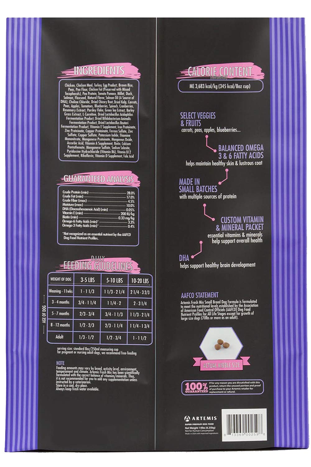 - HIGH-QUALITY INGREDIENTS - All of Artemis's premium diets are formulated with the highest quality ingredients to meet AAFCO requirements and to increase your pet’s longevity and quality of life. Dogs thrive on a diet rich in proteins and fats, from an array of meats. Fresh mix includes multiple 6 fresh meat protein: chicken, turkey, duck, and salmon; it also features concentrated chicken and fish meal. Fresh Mix has optimal protein levels for all stages of your pet’s life.