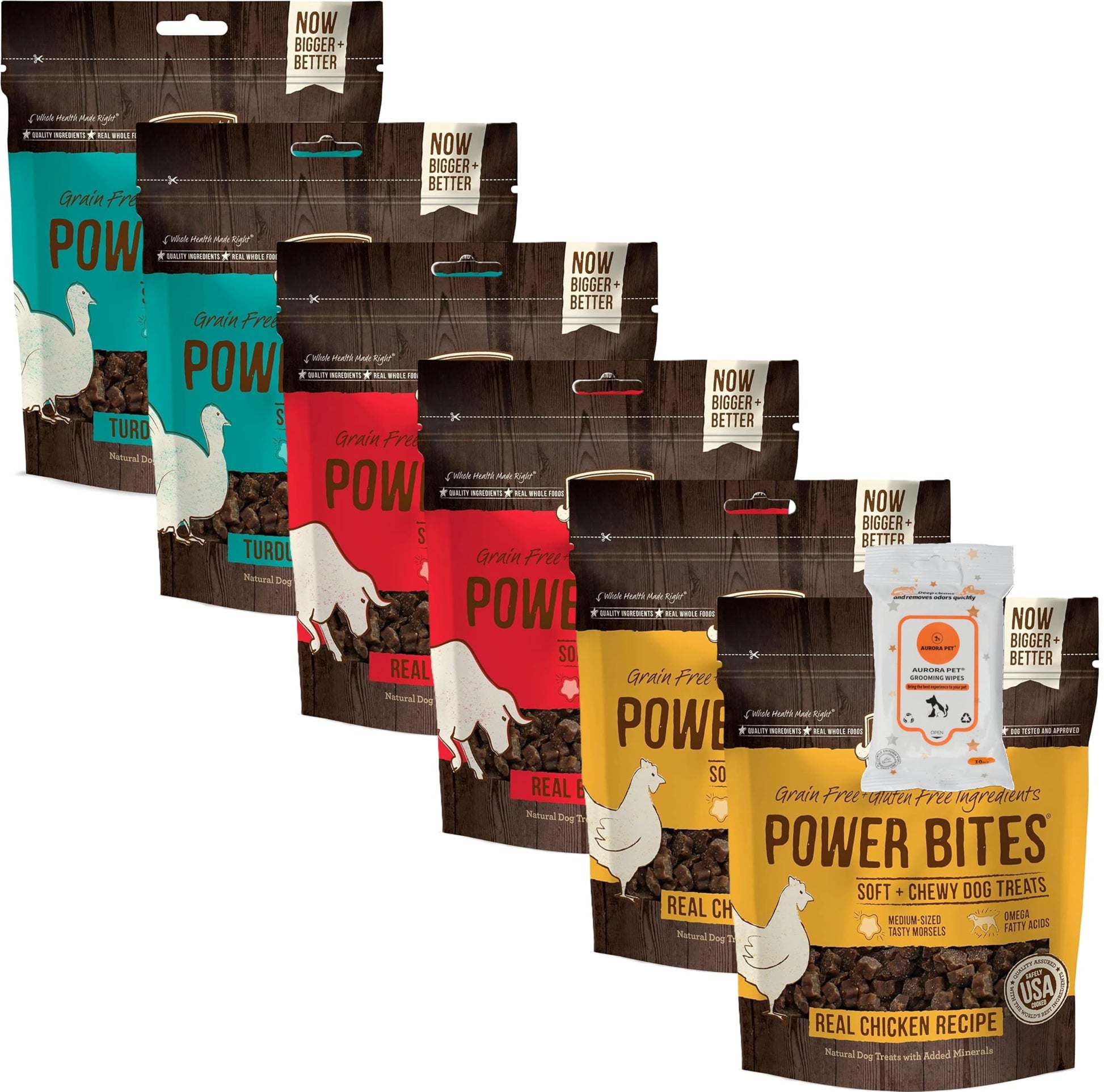 - Bundle Includes: Six (6) 6-oz bags of Power Bites Grain Free Dog Treats (2) Chicken (2) Beef (2) Turducken and (1) Aurora Pet Wipes (10 ct)