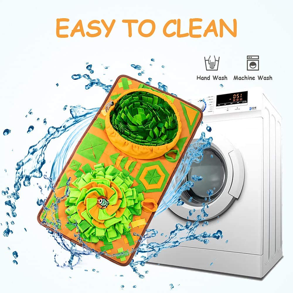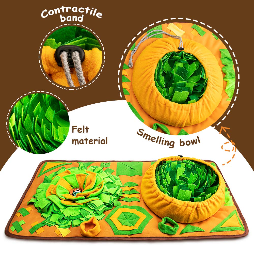 • [NON-SLIP & LARGE & DURABLE] Made of high-quality felt cloth with thick artificial grass blades, durable and pet-friendly. The bottom is a non-slip cloth that effectively holds the treat mat and prevents the dog from moving it. Petals and grass are sewn on dog training mat with thick cotton thread. The dog snuffle mat can be shrunk into a small storage bag and also can be hung or set aside when not use.