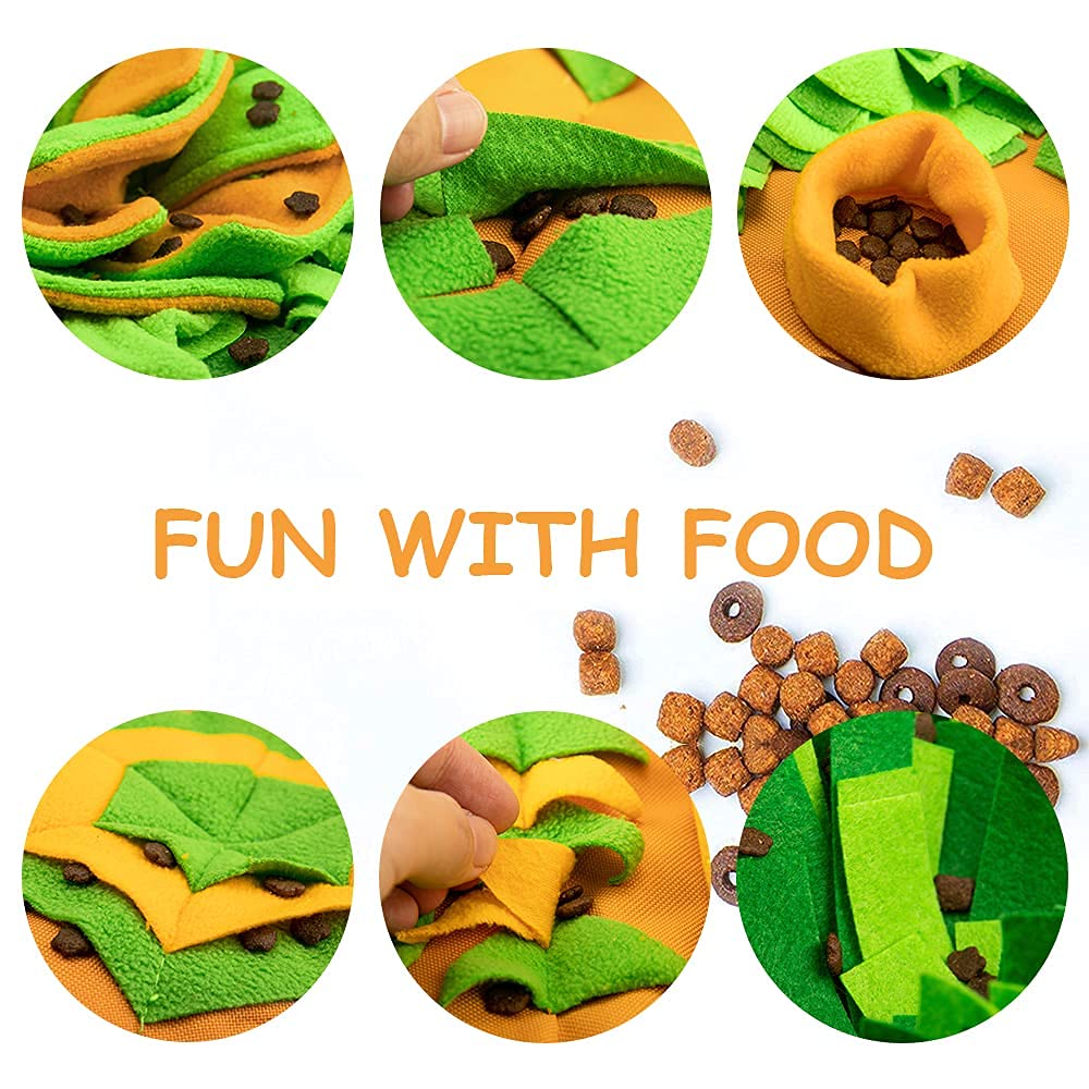 • [FUNNY TREAT FEEDING GAME]: The dog feeding mat has a big flower with 2 layers of orange petals and a big green messy grass for one or two dogs use at the same time. It can hide large food chunks and dog treat easily. AWOOF Pet Snuffle Mat has a squeaker under the logo and 3 pieces crinkle paper randomly place in the petal to attracts dog's attention and provide more fun.