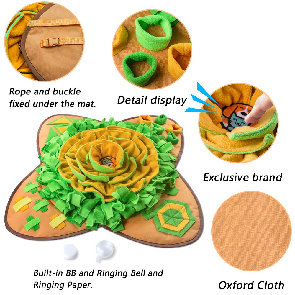 • EXTRA FUN ATTRACTS YOUR PUPPY – We are extremely positive of our snuffle mat. But in order to provide more fun for lovely puppies, we set up 4 additional feeding game for the smart and experienced dogs! And there is a BB call under the logo in the middle and 3 bells, 4 pieces of ringing paper randomly place in the petal.