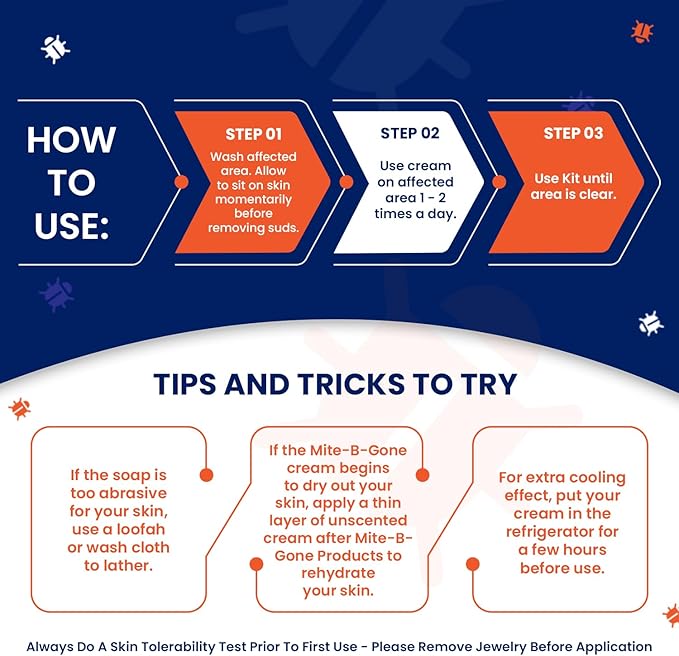 • OUR PRODUCT FORMS A DEFENSE LAYER ON YOUR SKIN: Mite-B-Gone is an extra-strength cream that powerfully provides fast relief for itchy and irritated skin and is gentle enough to use all over the body daily to form a skin defense layer on your skin for added protection against skin irritations and bites.