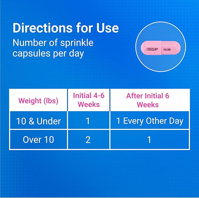 • Easy-to-Administer - Incorporating Cosequin into your cat’s daily routine is simple - just open the capsule and sprinkle the powder on their food at mealtime.