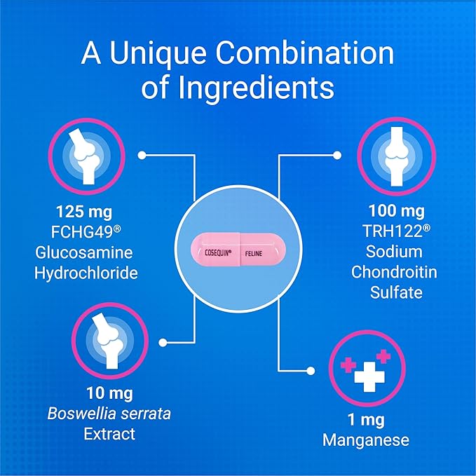 • Contains Glucosamine for Cats - Cosequin contains glucosamine hydrochloride (FCHG49) and sodium chondroitin sulfate (TRH122). This unique combination of ingredients supports healthy joints.