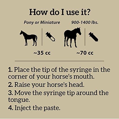 • HOW TO USE? - Place the tip of the syringe in the corner of your horse’s mouth. Raise your horse’s head. Move the syringe tip around the tongue. Inject the paste