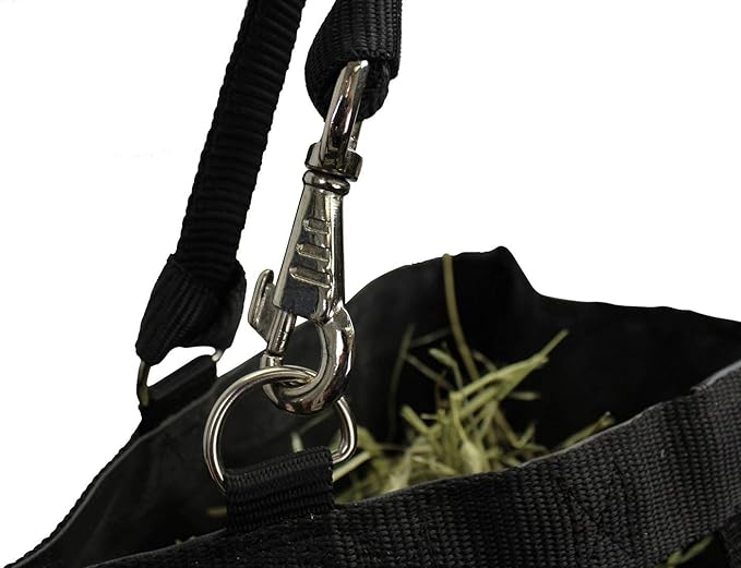 • Reinforced bottom design – Features a reinforced bottom made with overlapping nylon webbing for added strength and durability. This design also helps reduce hay waste by allowing debris to fall through.