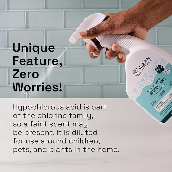 • Unique Feature: Hypochlorous acid is a part of the chlorine family, so there may be a faint scent. The hypochlorous acid is diluted for use around the home with children, pets, and plants