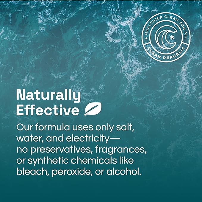 • Pure and Simple: Our natural formula is made with just salt, water, and electricity, with no preservatives, fragrances, or synthetic chemicals like bleach, peroxide, or alcohol. It is non-corrosive, eliminates odors, and freshens the air