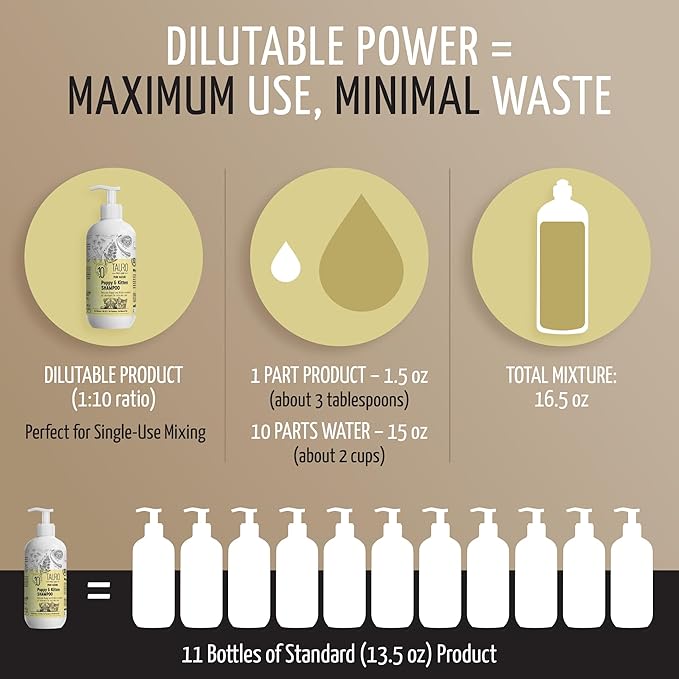 • Convenient Size for Everyday Use: Comes in a 13.5 fl oz bottle; dilutable 1:10; made in the EU fits easily on shelves with your favorite dog stuff, dog accessories, puppy stuff, and cat products; perfect for regular use in any dog wash or pet supplies routine