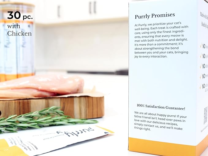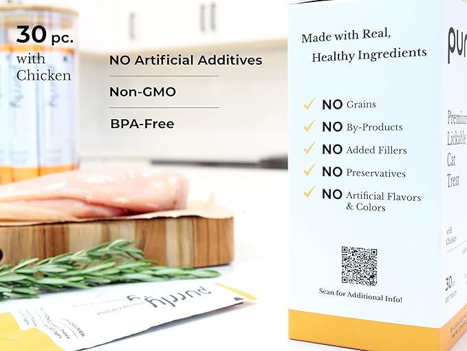 Purrly Lickable Wet Cat Treats Creamy Purée Human-Grade Chicken Breast with Prebiotic and Dietary Fiber for Digestive Health (30 Count) Non-Seafood Non-GMO No-Grains No-Artificial-Additives All Ages