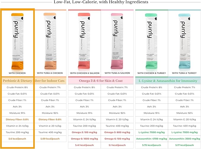 • HUMAN-GRADE PROTEIN SOURCES - Purrly uses only human-grade meat and fish as the primary protein source, exceeding industry standards and ensuring exceptional taste and unmatched nutritional value for your cat. These exquisite treats elevate snack time beyond ordinary treats, offering a truly gourmet experience that satisfies your feline's discerning palate. Each pouch serving unparalled quality and nutrition.