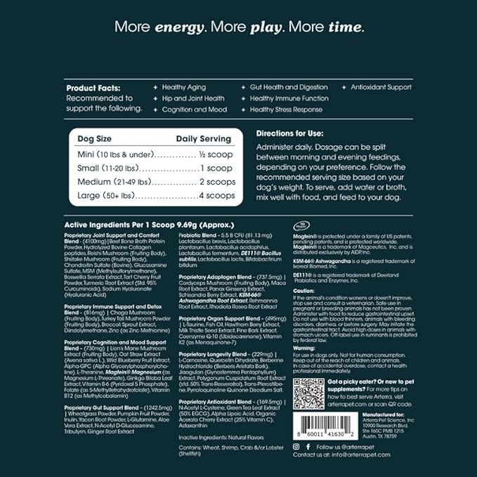 • Premium, Natural Ingredients: Made with 63 powerful ingredients for maximum anti-aging benefits, Arterra’s formula is developed by veterinarians and backed by science to ensure the highest quality and efficacy. Our product delivers more comprehensive health support than others on the market, significantly outperforming competitors in both ingredient quality and dosage. Made in the U.S.A., 100% filler-free, and backed by our Results Guarantee, Arterra is the superior choice for your dog’s health needs.
