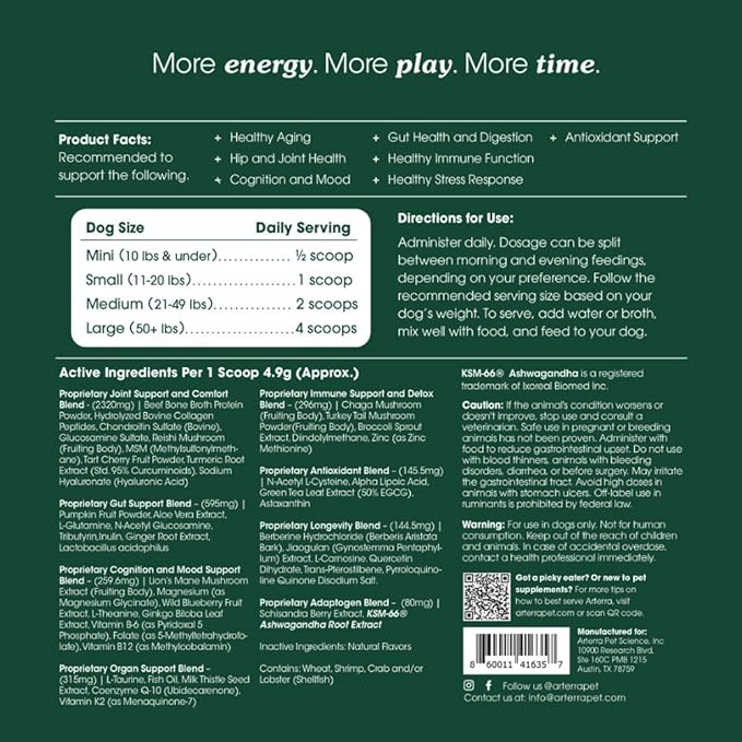• Premium, Natural Ingredients: Made with 46 powerful ingredients for maximum anti-aging benefits, Arterra’s formula is developed by veterinarians and backed by science to ensure the highest quality and efficacy. Our product delivers more comprehensive health support than others on the market, significantly outperforming competitors in both ingredient quality and dosage. Made in the U.S.A., 100% filler-free, and backed by our Results Guarantee, Arterra is the superior choice for your dog’s health needs.