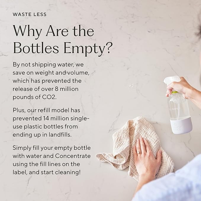 • SIMPLE, SUSTAINABLE CLEANING: Our refillable bottle system reduces Glass waste and lowers CO2 emissions, helping you contribute to a healthier planet without compromising on performance. By switching to this kit, you can eliminate dozens of single-use Glass bottles each year, supporting a sustainable cleaning routine that delivers sparkling clean results.