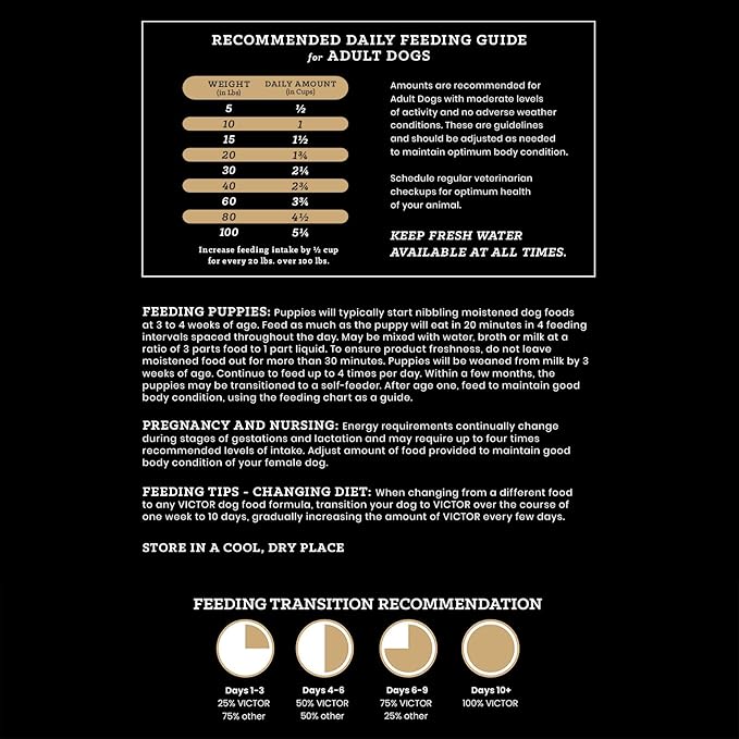 • MADE IN THE USA: We proudly produce every bag of VICTOR kibble in our own Texas-based facility and do not waver in our commitment to high-quality nutrition. A majority of ingredients of our pet food come from ranches, farms and other trusted suppliers who are within a day’s drive of our East Texas plant.
