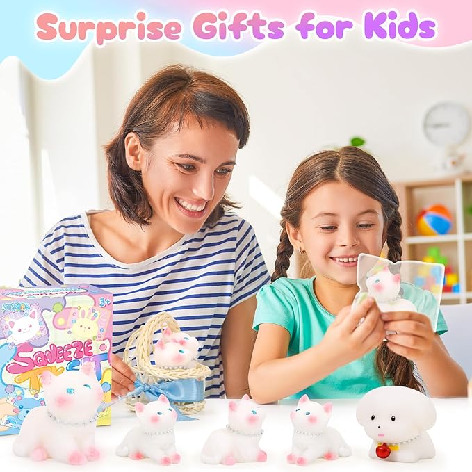 • Squishy Cat Toys Set: This value pack includes 1 cat, 3 kittens, 1 cat's nest, 1 puppy. The cute and lively designs bring endless joy, and the soft texture provides an extremely soothing tactile experience. Perfect for role playing and creative play, bringing players a fun interactive experience