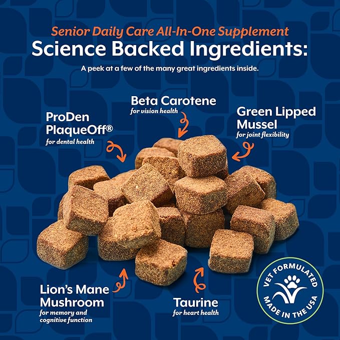• All-In-One Daily Care: Our daily care soft chews for dogs are formulated by trusted vets to help support your senior dogs with mobility, immune function, longevity, cognitive function, heart health, eye health, skin & coat, and dental care