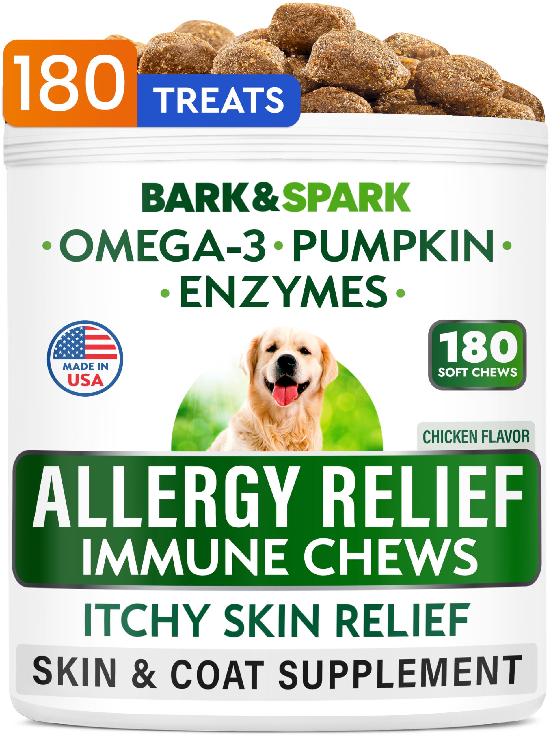 BARK&SPARK Dog Allergy Relief Chews (180 Immune Treats) - Anti-Itch Skin & Coat Supplement - Omega 3 Fish Oil - Itchy Skin Relief Treatment Pills - Itching&Paw Licking - Dry Skin & Hot Spots -Chicken