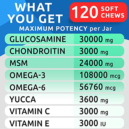 - Human Grade Glucosamine for Dogs plus Chondroitin, MSM, Yucca and Omega, all combined to created comprehensive joint supplement for dogs, supporting healthy joints, helping to ease pain and discomfort from ageing, inflammation or hip dysplasia.