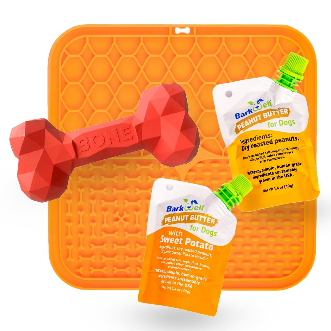 BarkWell Dog Durable Chew Toy for Treats and Peanut Butter, Natural Rubber Diamond Bone (S, Red), Includes Lick Mat and 2 Peanut Butter Pouches