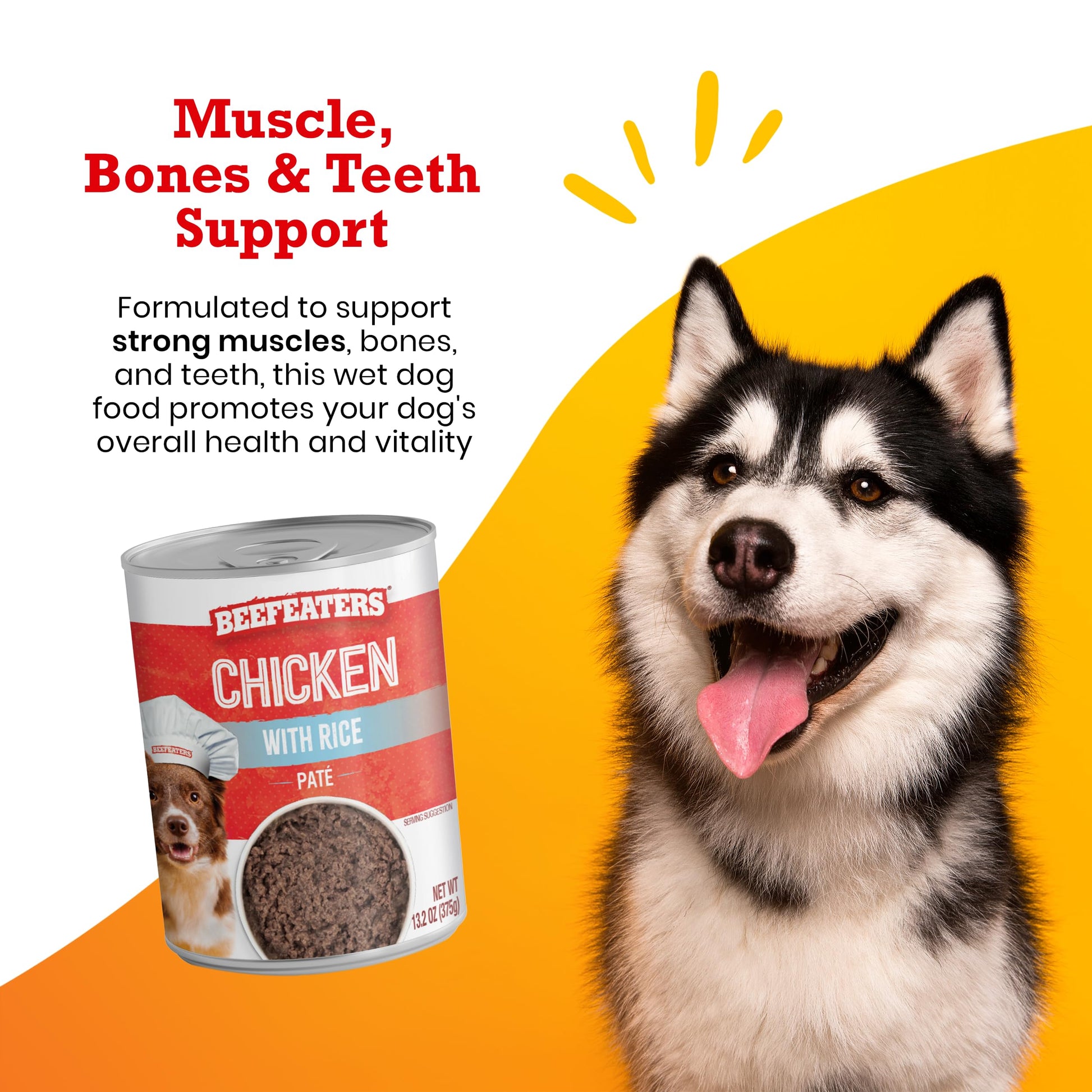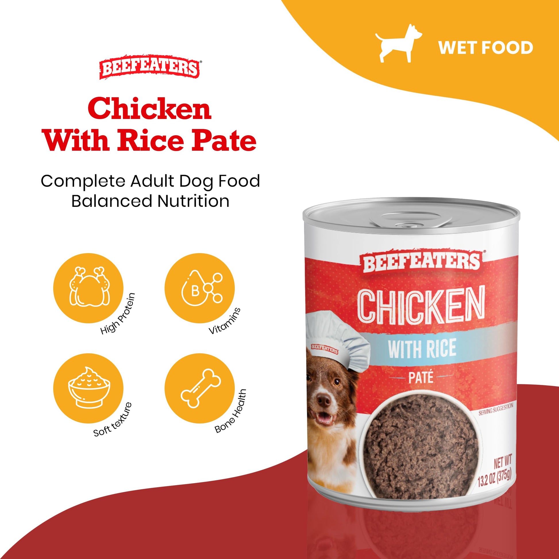 Details: Introducing Beefeaters Chicken with Rice Pate, a premium wet dog food designed to provide complete and balanced nutrition for adult dogs. Each 13.2oz can, available in a convenient case of 12, is crafted to meet the nutritional needs of your furry friend, ensuring they receive a wholesome meal with every serving. Our Chicken with Rice Pate is created using only the finest ingredients, including high-quality chicken for protein and rice for a gentle source of carbohydrates. This combination results in a meaty pate with a soft texture that dogs adore, making mealtime a joyful occasion. Understanding the importance of your dog's health, our wet dog food is formulated with optimal levels of vitamins and minerals. It supports strong muscles, bones, and teeth, contributing to your dog's overall well-being and physical condition. Additionally, the inclusion of key nutrients promotes healthy skin and a lustrous coat, reflecting the inner health of your pet. Beefeaters Chicken with Rice Pate is not just nutritious; it's also convenient. The case of 12 cans makes it easy to keep a supply of high-quality wet dog food on hand, ready to serve at room temperature. For freshness, refrigerate any opened cans in a proper container and use within three days. Choose Beefeaters Chicken with Rice Pate for a wet dog food that combines delicious flavor with comprehensive nutrition. It's the perfect way to ensure your dog enjoys a balanced diet that supports their health and happiness. With Beefeaters, feeding your dog a premium diet is simple and satisfying, ensuring they thrive with every meal.