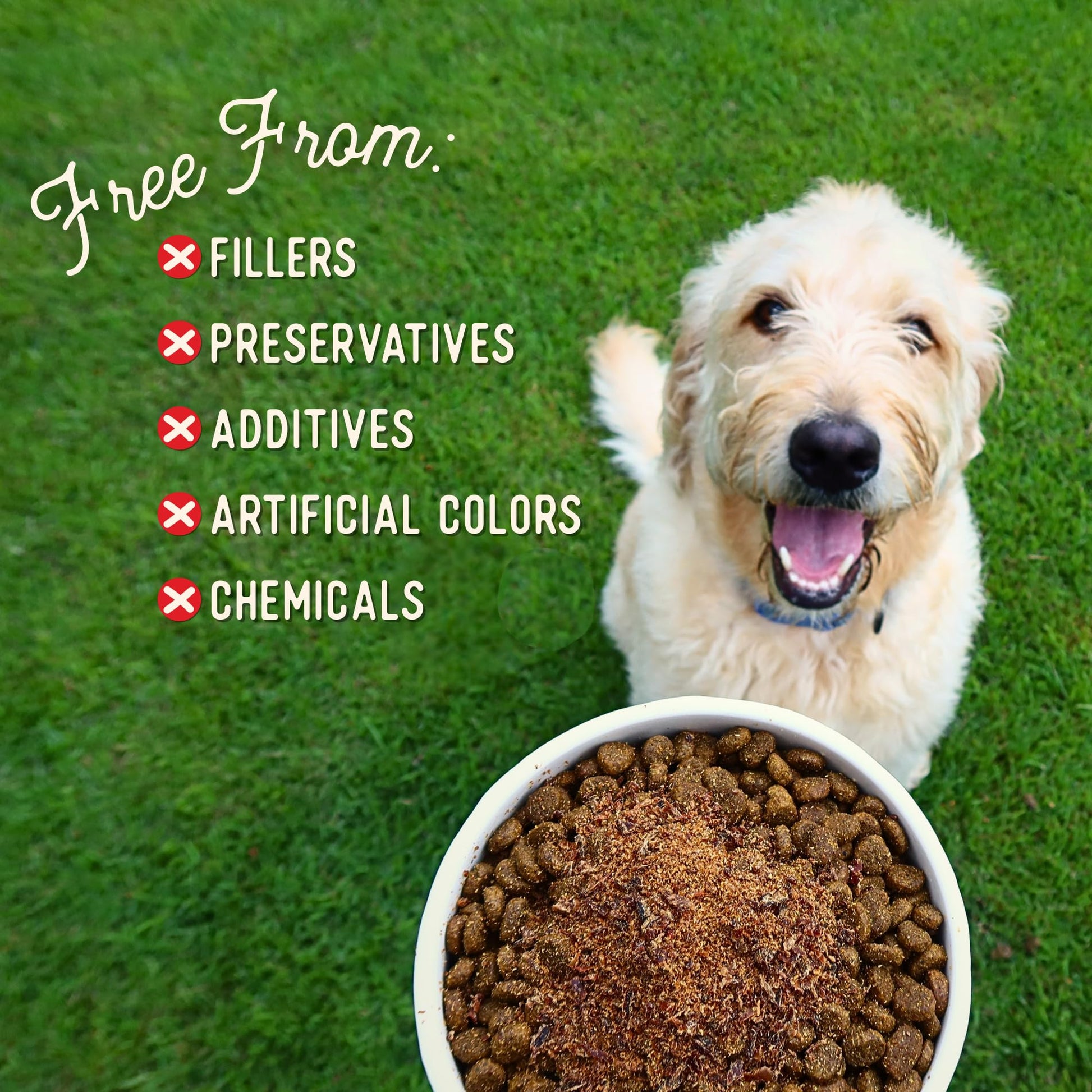 - FORGET THE UNHEALTHY FREEZE-DRIED, POWDERED OR BITES TOPPERS - Say goodbye to freeze-dried dog food, powdered or unhealthy bites with dangerous additives and give your pup the quality they deserve with our superior all-natural, air-drying method that preserves vital nutrients, vitamins, and enzymes essential for your pet's well-being. Our premium dog food dinner sprinkles ensure your puppy gets the perfect punch of protein in her diet - an exceptional dog food enhancer suitable for all breeds!